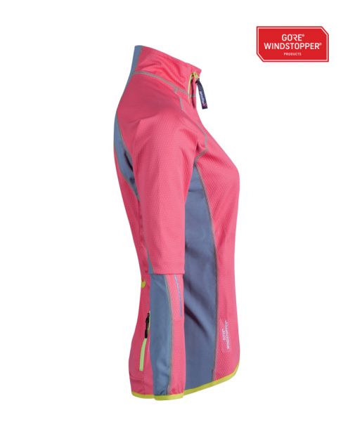 Campera de mujer diseñada para ciclismo u otro deporte aeróbico de alta exigencia, donde se necesite protección contra el viento, transportar poco peso, ideal para días de baja temperatura. Tejidos GORE WINDSTOPPER® Soft Shell y POLARTEC® Power Strech.