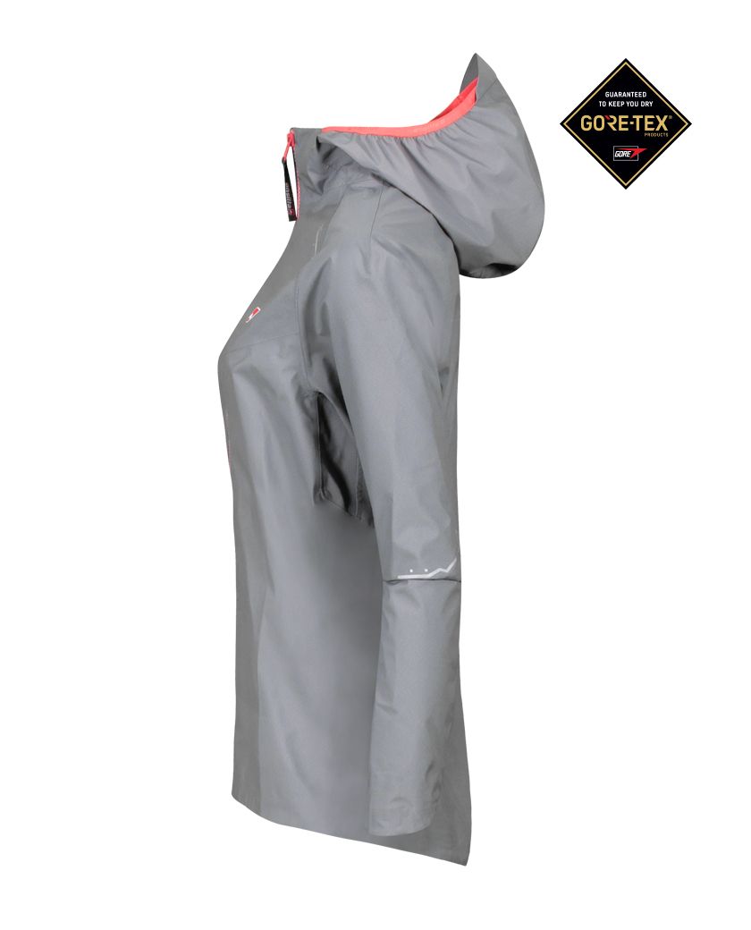 Esta prenda innovadora tiene todo lo que una corredora busca al hacer su actividad en condiciones extremas: primordialmente el bajo peso, es una prenda muy ligera y sumado el calce -pensado de manera estricta para corredoras- hacen que la campera sea muy cómoda. Las mangas un poco más largas que lo convencional, con el codo premoldeado están pensadas desde el confort en plena actividad aeróbica. Los puños son parcialmente elastizados y tienen una protección que cubre parte de la mano. El ajuste de la cintura se proporciona por medio de un elástico y tanca, ésta última se encuentra en la parte trasera de la campera. La capucha cuenta con los bordes elastizados y tiene un ajuste horizontal arriba de la nuca, además cuenta con una pequeña visera laminada la cual se puede doblar en caso de no querer usarla. Tiene un bolsillo interno pegado. Sólo tiene un cierre, el frontal, éste es estanco impidiendo el paso del agua y aire. Las ventilaciones axilares son detalles de las uniones de piezas, se decidió evitar el uso de cierres para reducir aun más el peso de la prenda. Todas las costuras son termoselladas, la campera está confeccionada con tejido GORE-TEX® Active CKNIT el cual mejora la transpirabilidad hasta en un 15 % en una construcción de 3 capas menos voluminosa y menos robusta. El suave forro de punto permite poner y sacar las prendas con más facilidad.