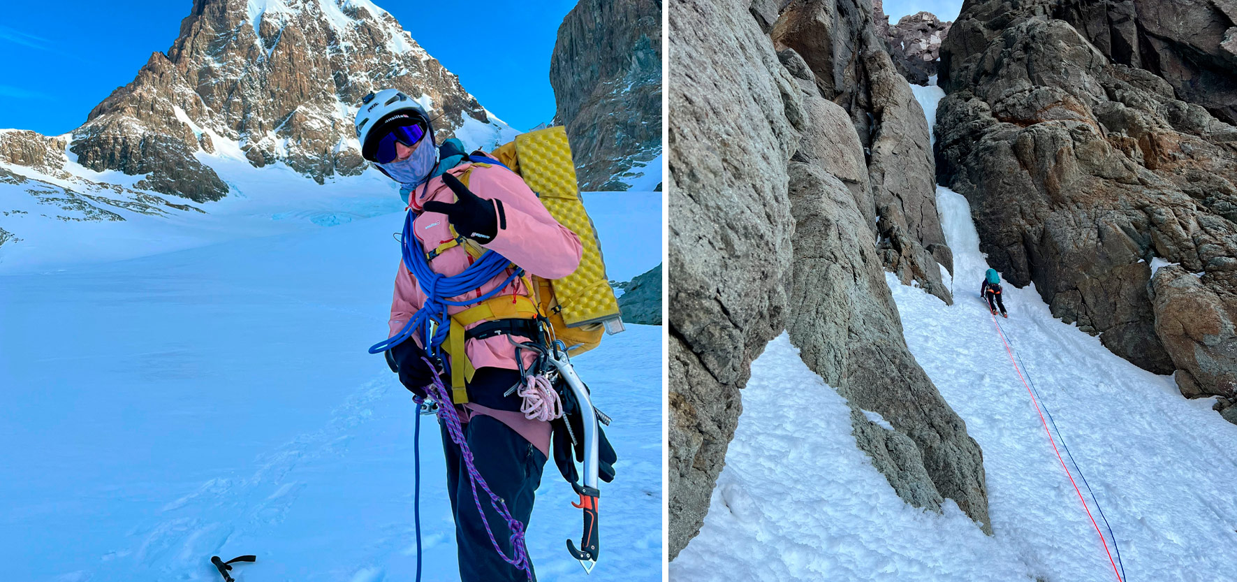 El 6 de noviembre sonó la alarma a las 2 am y las tres nos activamos de inmediato: calentar agua para los mates, picar algo sin hambre y entregarnos a una pared de 1000 metros totalmente desconocida. Dejamos un pequeño depósito en la base con comida y nos acercamos a la canaleta elegida bajo la luz de la luna llena. Comenzamos a escalar en simultáneo lo que parecía una pala de nieve empinada, pero al cruzar una rimaya y algunas grietas menores nos dimos cuenta de que no era un nevé sino parte del glaciar. Al entrar a la canaleta propiamente dicha avanzamos rápido, cubriendo unos 200 m, hasta que un cambio abrupto en el terreno nos detuvo. La canaleta se cerraba en un estrecho canal; tomé la punta de la cuerda y alcancé la parte superior a través de un largo muy suelto y delicado de M3, WI2.