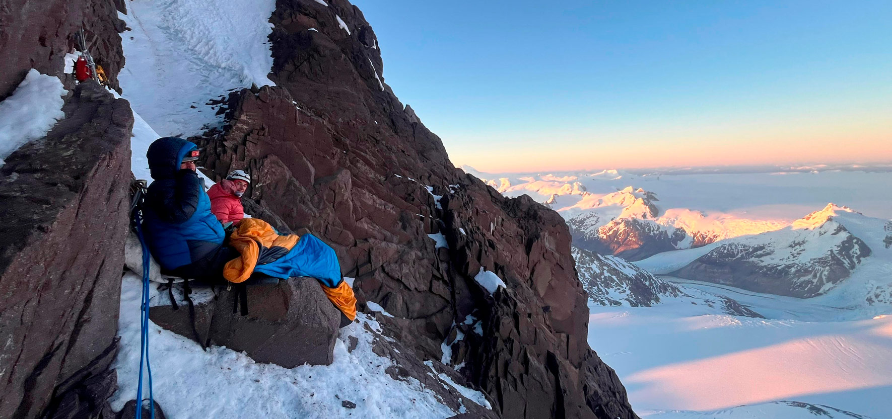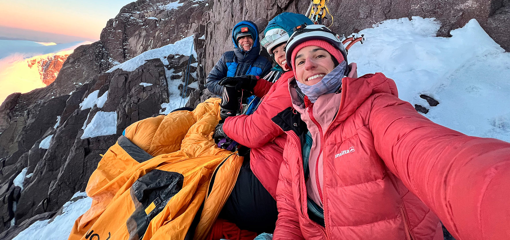 Más arriba distinguimos lo que creíamos que era la arista cumbrera, con bandas escalonadas de roca y nieve para llegar hasta allí. “En alguna de esas repisas debe haber un lugar plano”, pensamos, y seguimos escalando entrada la noche. A las 18 horas de haber comenzado el día, el sol empezaba a bajar. Estábamos exhaustas y no había lugar para vivaquear. Tras intentar algunas alternativas desesperadas, aceptamos a regañadientes que pasaríamos la noche colgadas del arnés. Rapelamos unos 20 metros hasta lo que parecía un miserable rectángulo inclinado, apenas lo suficiente para que las tres pudiéramos sentarnos con los pies colgando. Armamos una reunión de donde quedaríamos colgadas junto a todo nuestro equipo hasta que saliera el sol. Fue una noche dura; el único consuelo: pensar en el mate de la mañana.
