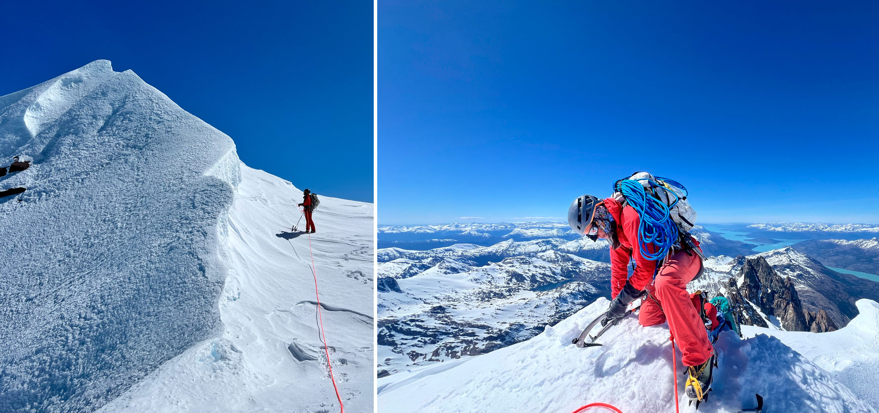 Comenzó Palo los últimos 80 metros de mixto M3 hacia la arista cumbrera. A las 10 a.m. estábamos bajo una enorme cornisa en forma de ola sobre nuestras cabezas. Cata tomó la punta y escalamos en simultáneo hongos y olas de nieve y escarcha increíbles, hasta alcanzar un plano bajo la cumbre. Un último largo de nieve fácil nos dejó en un pequeño pedestal de 2x2 m. No quedaba más montaña por subir: nuestro sueño salvaje y descabellado se había vuelto realidad. Acabábamos de realizar el segundo ascenso del Cerro Steffen, 60 años después, y habíamos abierto una nueva ruta en la cara Oeste.