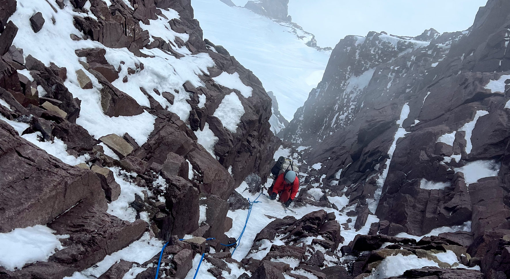 Otro tramo de nieve dura de 60º nos llevó a una canaleta estrecha que parecía de WI3. Al reunirnos nos enteramos que una de las cuerdas se había chutado: se le veía el alma directamente. Una alerta nos resonó en la cabeza y por alguna razón, sincrónica quizás, ninguna se preocupó, sino que se ocupó de proponer soluciones para continuar aún bajo estas condiciones. Así es que decidimos seguir. Palo tomó la punta de la cuerda sana y al encarar lo que parecía un primer largo de WI3 se dió cuenta de que era mucho más vertical. Tras 50 m de WI4 sostenido, armó una reunión con protección en roca. Otro largo conectó 20 m de WI3+ con movimientos de roca M4 hasta una rampa de nieve dura. Desde allí volví a tomar la punta y continué por terreno de mixto de M4, por momentos sólido y por momentos podrido. Volvía a resonar la idea de que sólo teníamos una cuerda entera y temía tirar material a mis compañeras y dañar la cuerda.