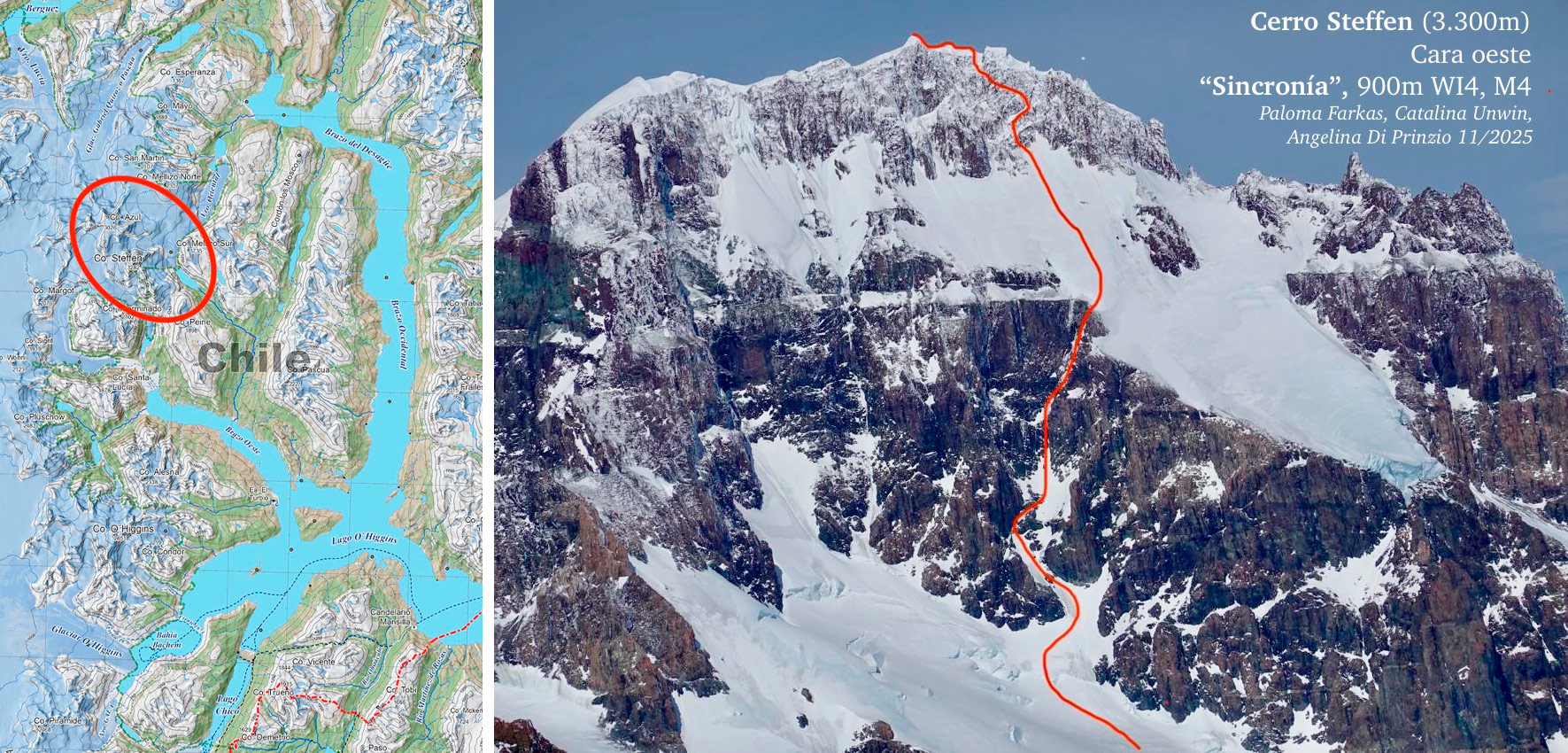 Apertura de la vía “Sincronía” y 2º ascenso registrado al Cerro Steffen (3.300 m), en el Campo de Hielo Sur, por Angie Di Prinzio, Paloma Farkas y Catalina Unwin